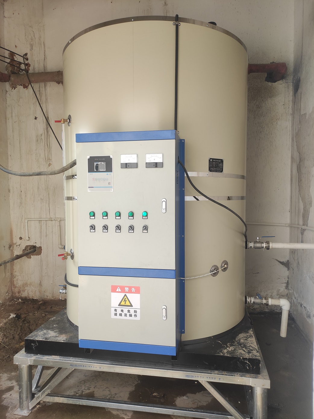 走進(jìn)甘肅省慶陽(yáng)市鎮(zhèn)原縣屯字中學(xué)的校園,來(lái)到學(xué)校的開(kāi)水房,就會(huì)迎面看到一臺(tái)可大的電開(kāi)水鍋爐穩(wěn)座在鐵制的支架上,象牙白色的圓柱形爐體的正前方裝配著一個(gè)配套的配電柜,上柜門上鑲嵌著微電腦鍋爐控制器、電壓表、電流表和幾個(gè)旋鈕開(kāi)關(guān)及指示燈,下柜門上粘貼著警告標(biāo)識(shí):“有電危險(xiǎn),請(qǐng)規(guī)范操作”,PP棉過(guò)濾器、電磁閥、止回閥等相關(guān)配件在鍋爐的進(jìn)水管道上裝著,出水管道則連向屋外,室外的供水管道一下子裝了好多個(gè)開(kāi)水嘴,鍋爐頂部的大氣連通管朝下直豎著,一根黑色的電纜線接到了配電柜內(nèi)的漏電保護(hù)器上,這就是一臺(tái)新安裝的3噸72千瓦常壓電開(kāi)水爐。